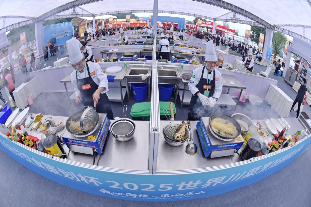 11月1日,第八届世界川菜大会在四川乐山举行。厨师在2025世界川菜烹饪技能大赛比赛中。新华社发(李向雨摄)
