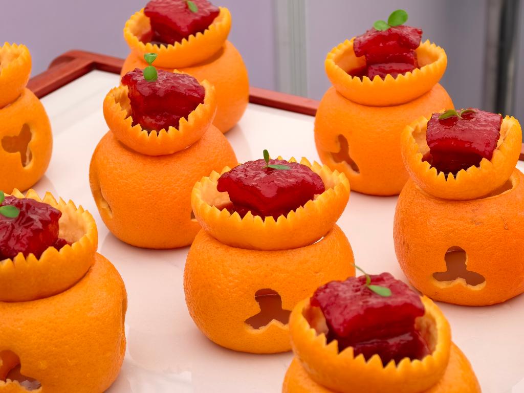 11月1日,第八届世界川菜大会在四川乐山举行。在2025世界川菜烹饪技能大赛现场,“橙香方肉”新鲜出炉。新华社记者边思琪 摄